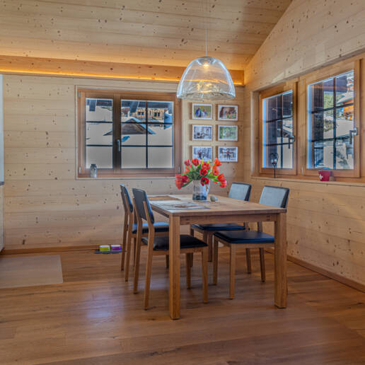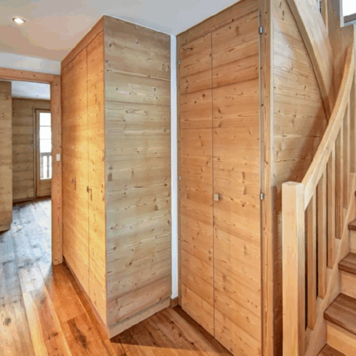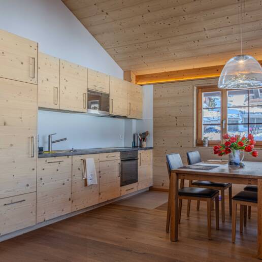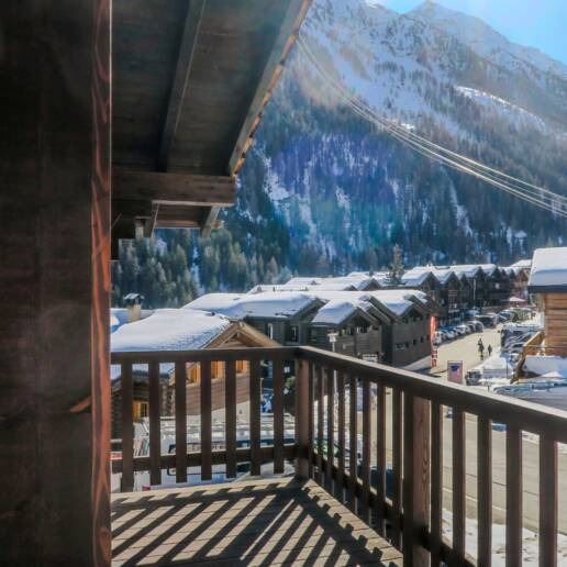 Built in 2017 the apartment is in excellent condition having never been rented out. It has 2 double bedrooms, one on the ground floor with built-in cupboards, a balcony and an ensuite shower. The second bedroom is upstairs, also with built-in cpboards and a south-facing balcony. It is adjacent to the open plan kitchen and living room and the second bathroom. The living room balcony wraps around the corner of the chalet and presents views over the village and the valley.