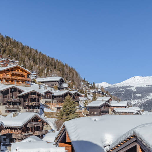 Ideally located less than 100m from the shops, ski school and restaurants and 150m from the lift station, this exceptional 2-bedroom apartment enjoys views over the old village of Grimentz and across the valley. The apartment is one of two in this chalet and there is a parking space by the front door as well as a covered parking space below the property.