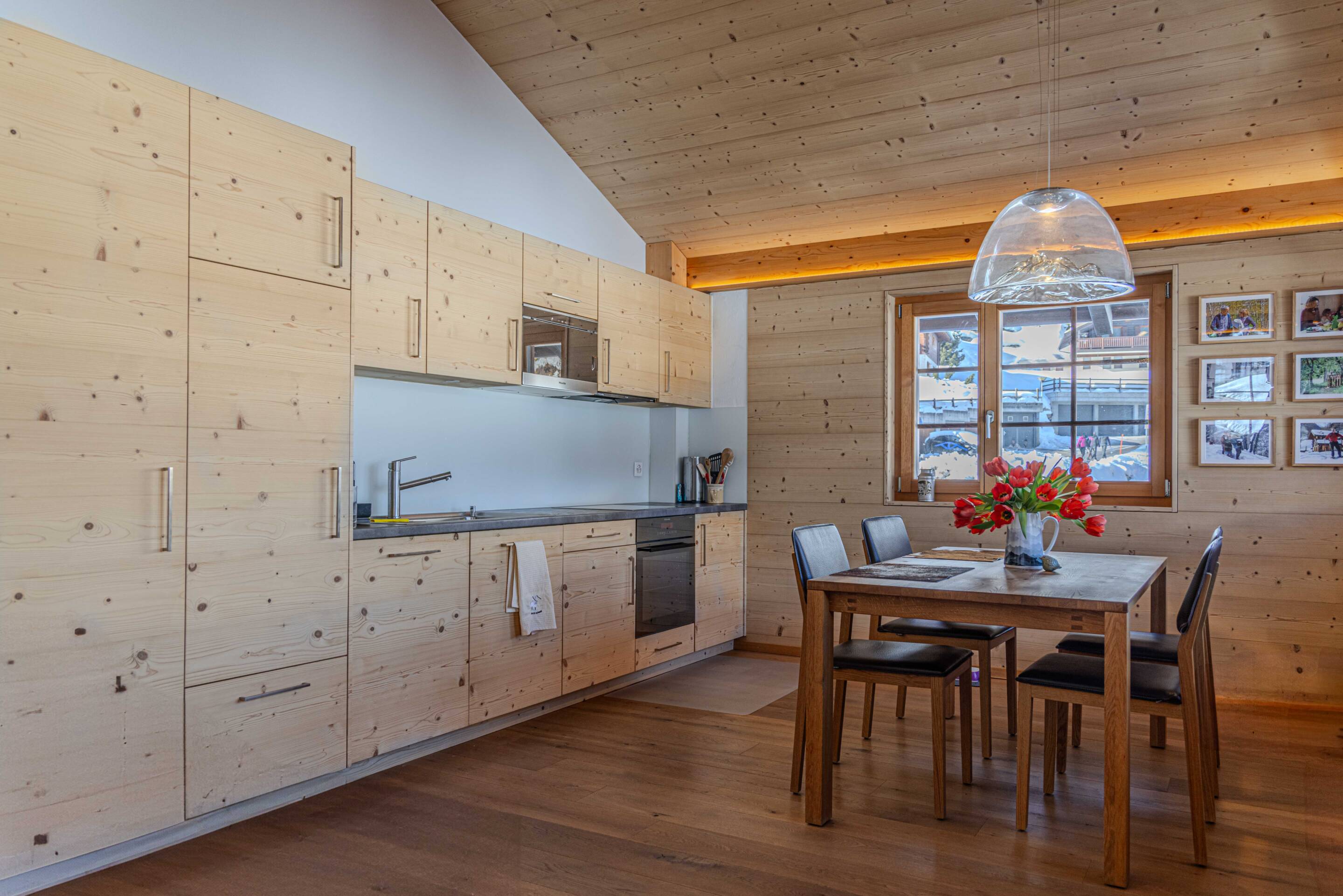 Built in 2017 the apartment is in excellent condition having never been rented out. It has 2 double bedrooms, one on the ground floor with built-in cupboards, a balcony and an ensuite shower. The second bedroom is upstairs, also with built-in cpboards and a south-facing balcony. It is adjacent to the open plan kitchen and living room and the second bathroom. The living room balcony wraps around the corner of the chalet and presents views over the village and the valley.